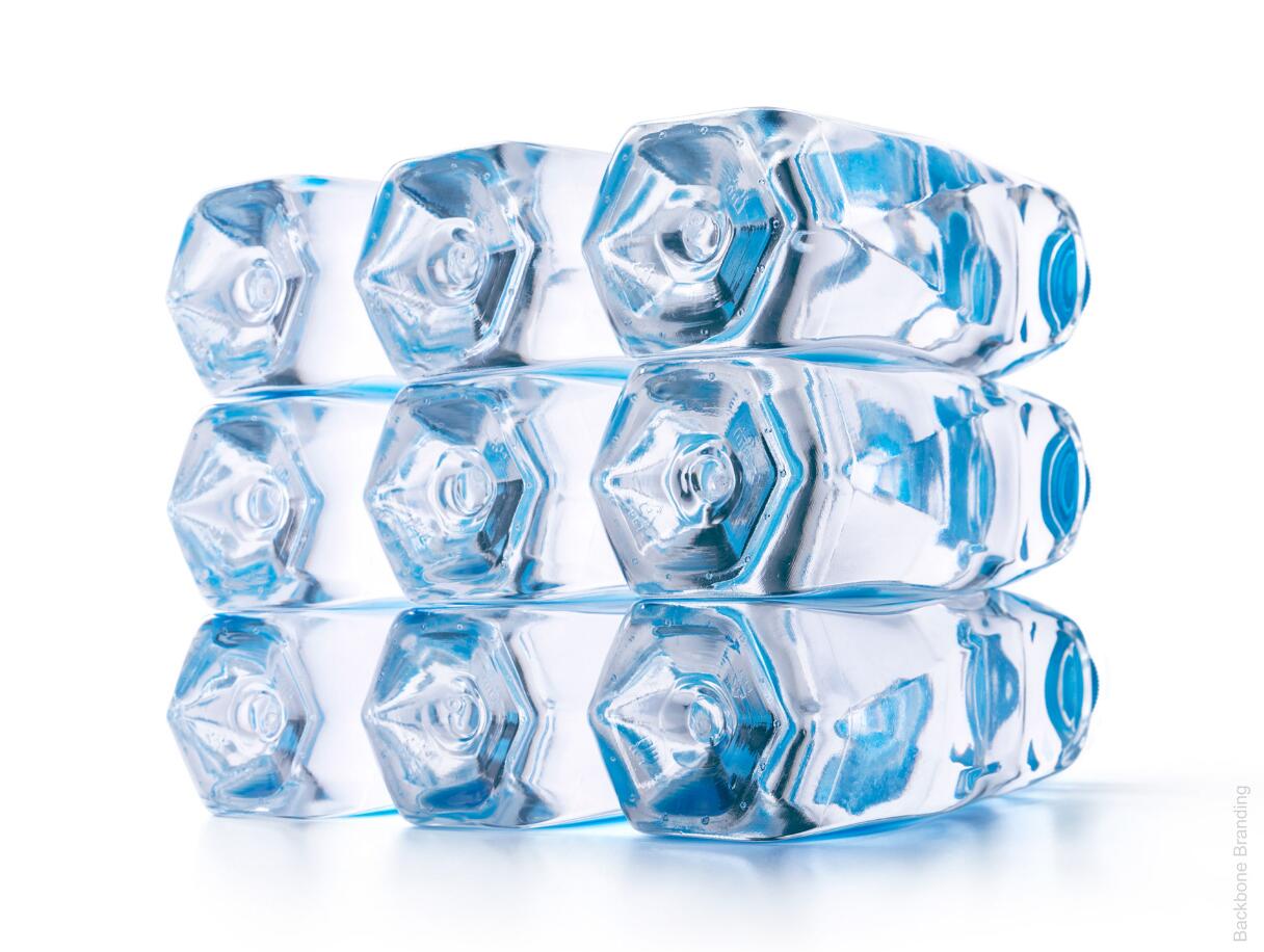 背面标签的蓝色色调与瓶子和谐地融为一体,并且由于光线在水中的折射,使瓶子可见。由于蓝色着色的背面标签,透明标签上的品牌白色徽标变得明显。